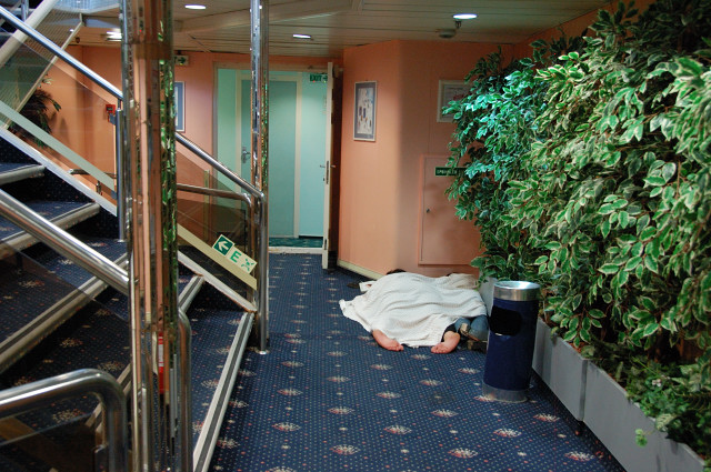 因為我看到一堆外國人,舖著墊子蓋著睡袋在地上亂睡...