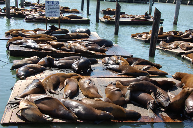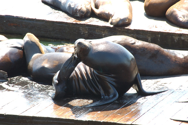 對了!這邊還有很出名的海獅,就一大群的趴在木板上,嗚嗚嗚的一直叫...
